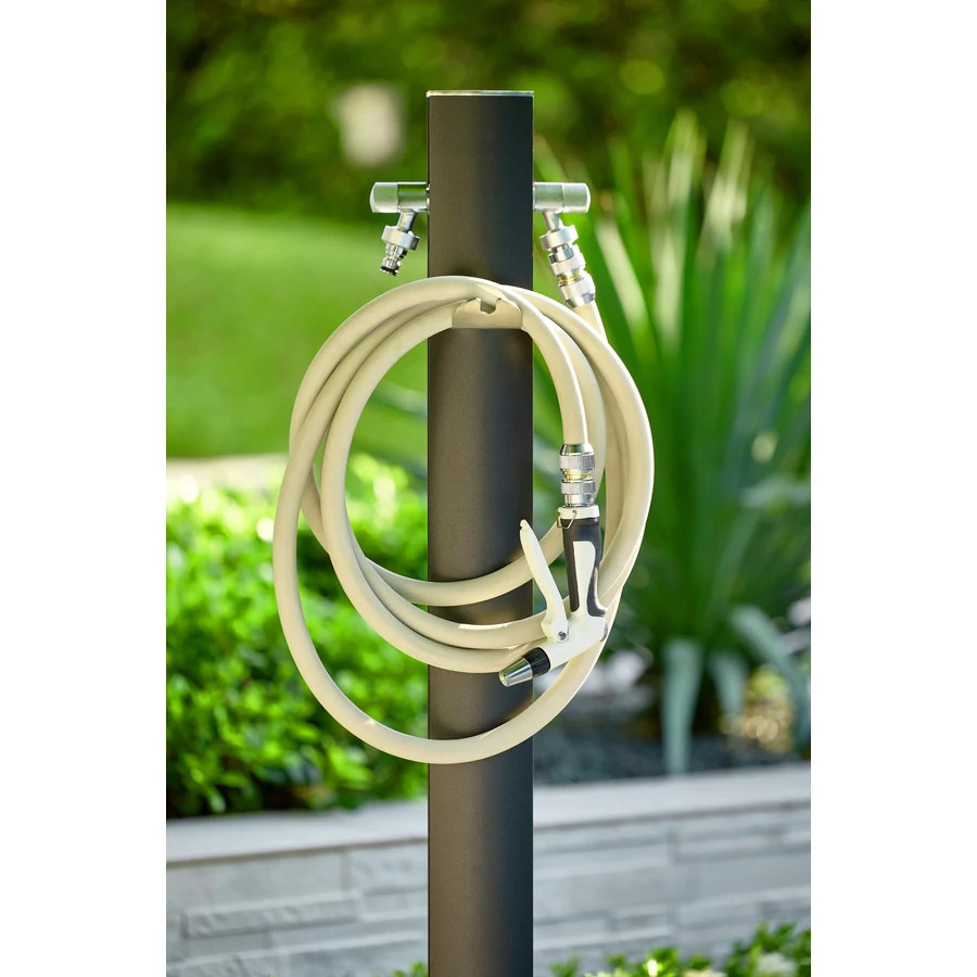 A kiváló minőségű, porfestett alumínium test teljes mértékben korrózióálló, és nedves talajba süllyesztve sem rozsdásodik. A kültéri porfestés ellenáll az UV-sugárzásnak és az időjárási hatásoknak, így a kút hosszú távon is megőrzi eredeti megjelenését. A csomag részét képező rozsdamentes acél tömlőtartó segít a locsolócső rendezett tárolásában.