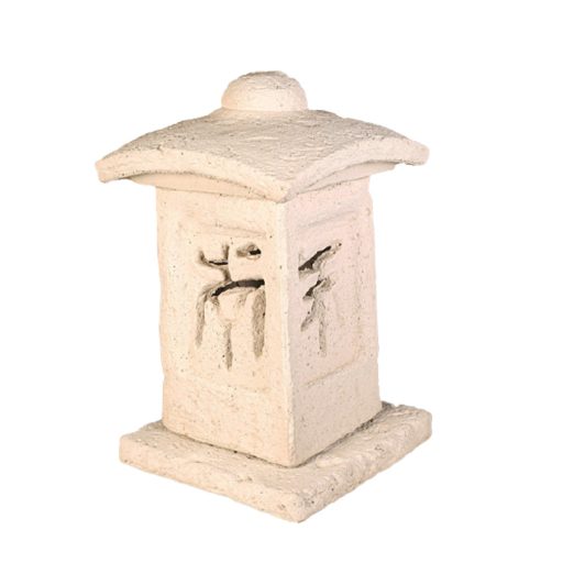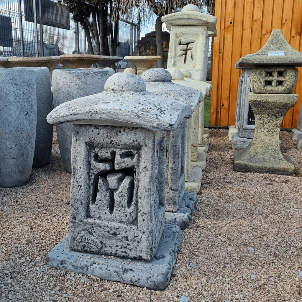 Kő hatású kerti lámpa oldalain a négy égtáj szimbólumaival.