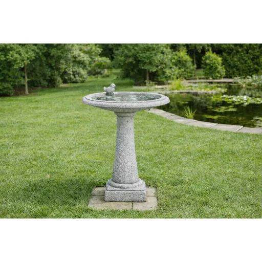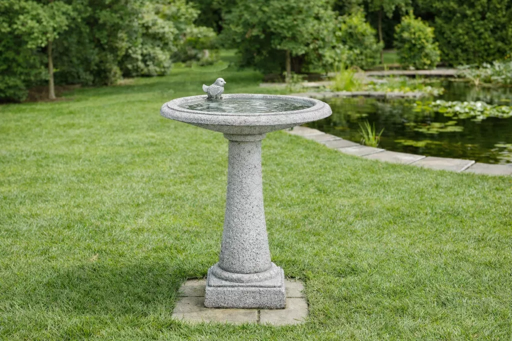 Oszlopon álló kő hatású madáritató tál dekorációs madárka figura nélkül.