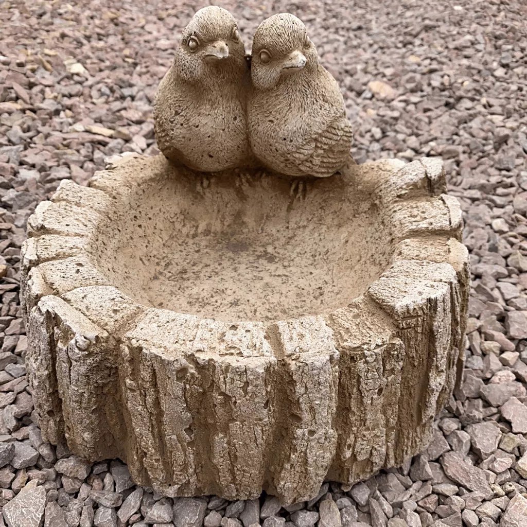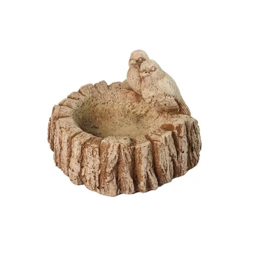 Madárkával díszített, fatörzs formájú beton madáritató. Kertje ékes díszítő elemévé válhat, mindamellett, hogy a madarak életét is támogatja.  Anyagának és a speciális színezésnek köszönhetően fagyálló kerti dekoráció.   Fontos: A speciális színezési folyamatok miatt a termékek színe eltérhet a valóságban a képen látottaktól.  Nem ajánlott magas nyomású készülékkel a termék tisztítása.