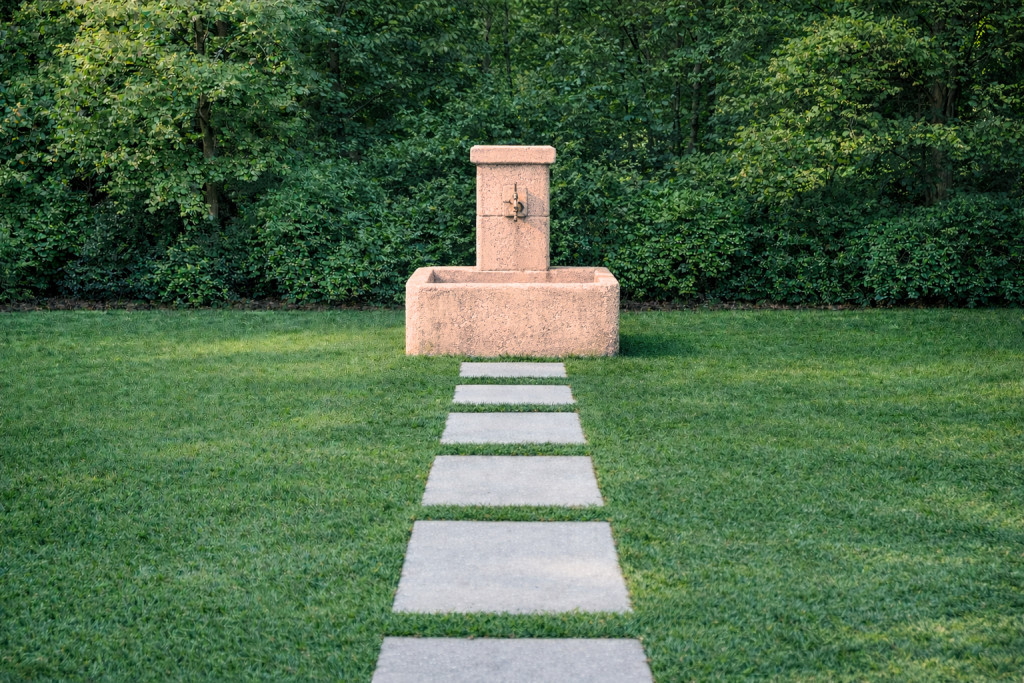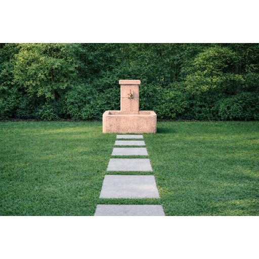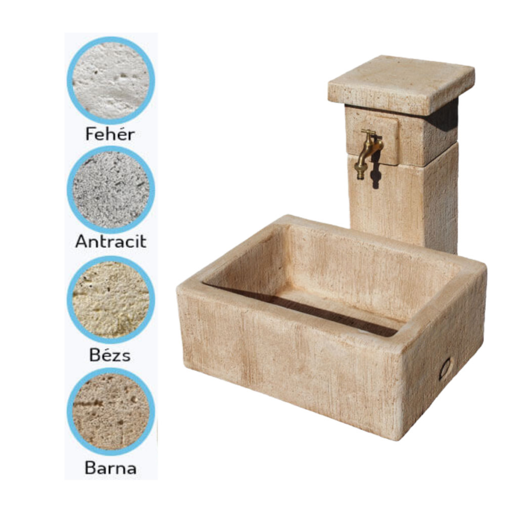 Kő hatású szögletes oszlopos kerti kút kifolyó tálcával.