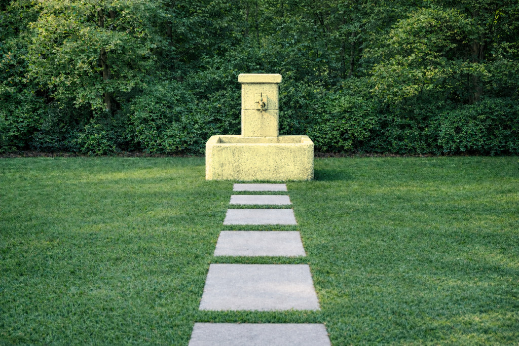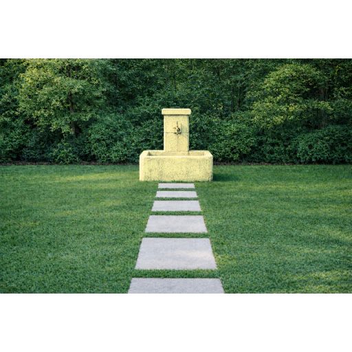 Kő hatású szögletes oszlopos kerti kút kifolyó tálcával.