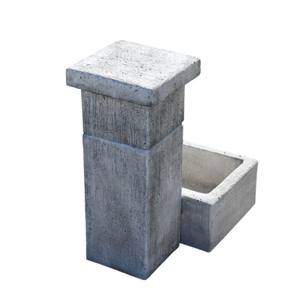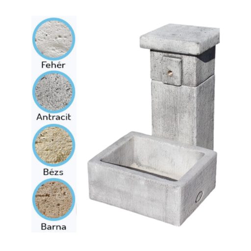 Kő hatású szögletes oszlopos kerti kút kifolyó tálcával.
