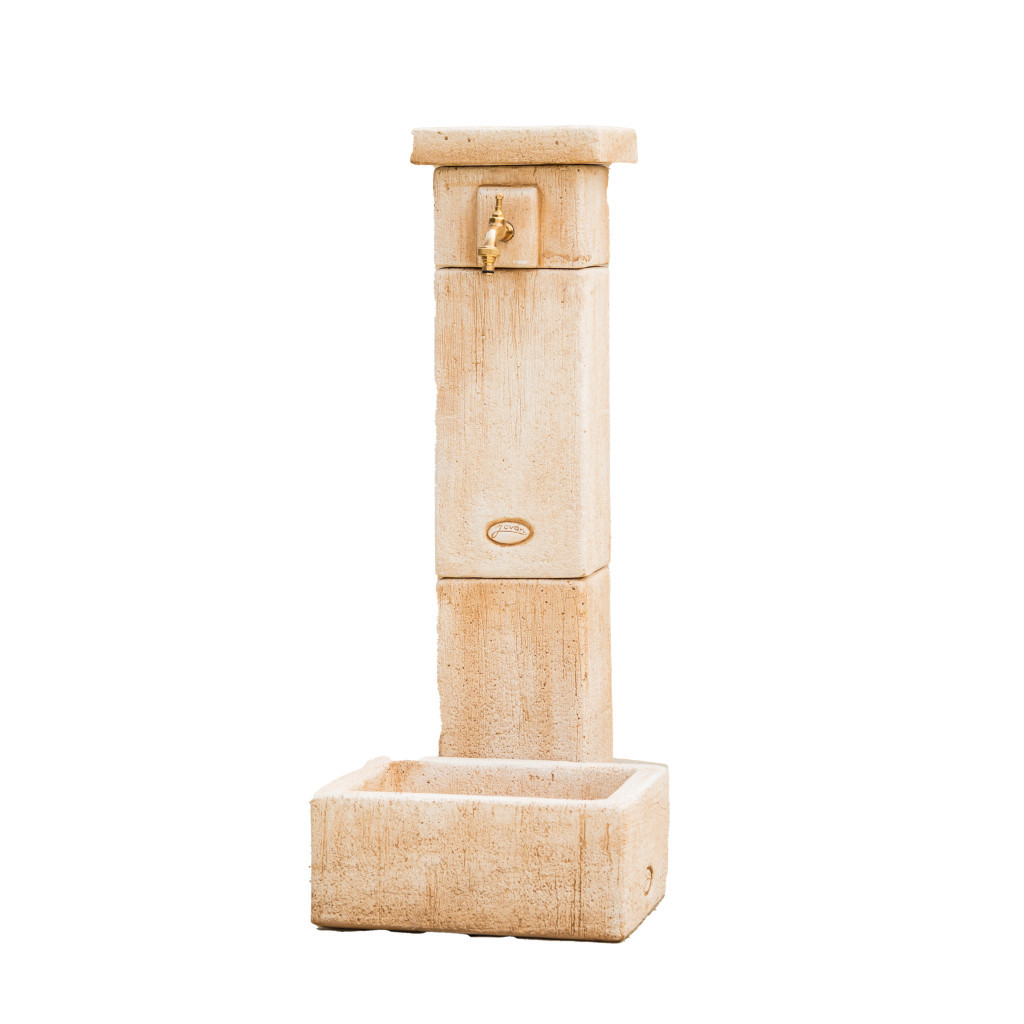 Kő hatású szögletes oszlopos kerti kút kifolyó tálcával.