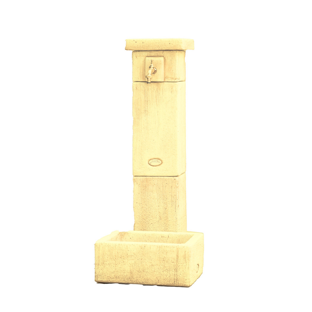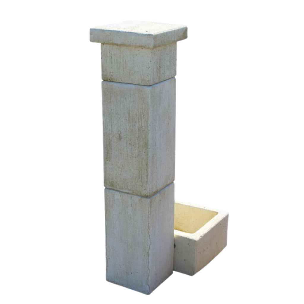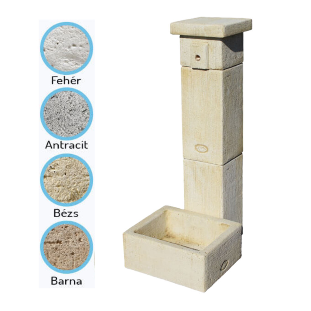 Kő hatású szögletes oszlopos kerti kút kifolyó tálcával.