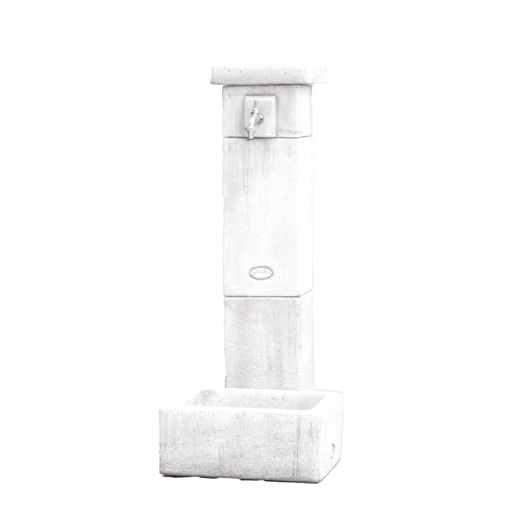 Kő hatású szögletes oszlopos kerti kút kifolyó tálcával.