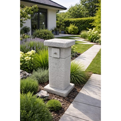 Kő hatású szögletes kútoszlop kifolyó tálca nélkül.