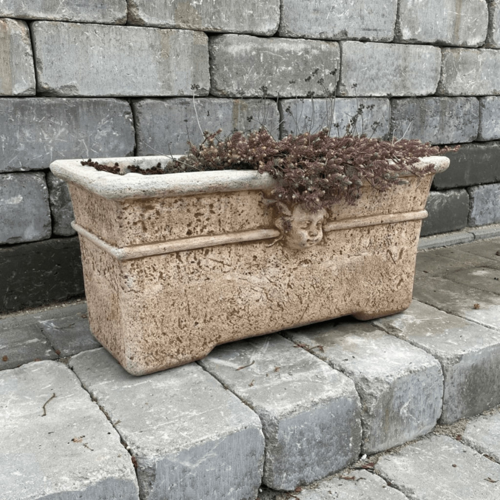 Kő hatású időjárásálló kerti virágvályú Medici fej díszítéssel.