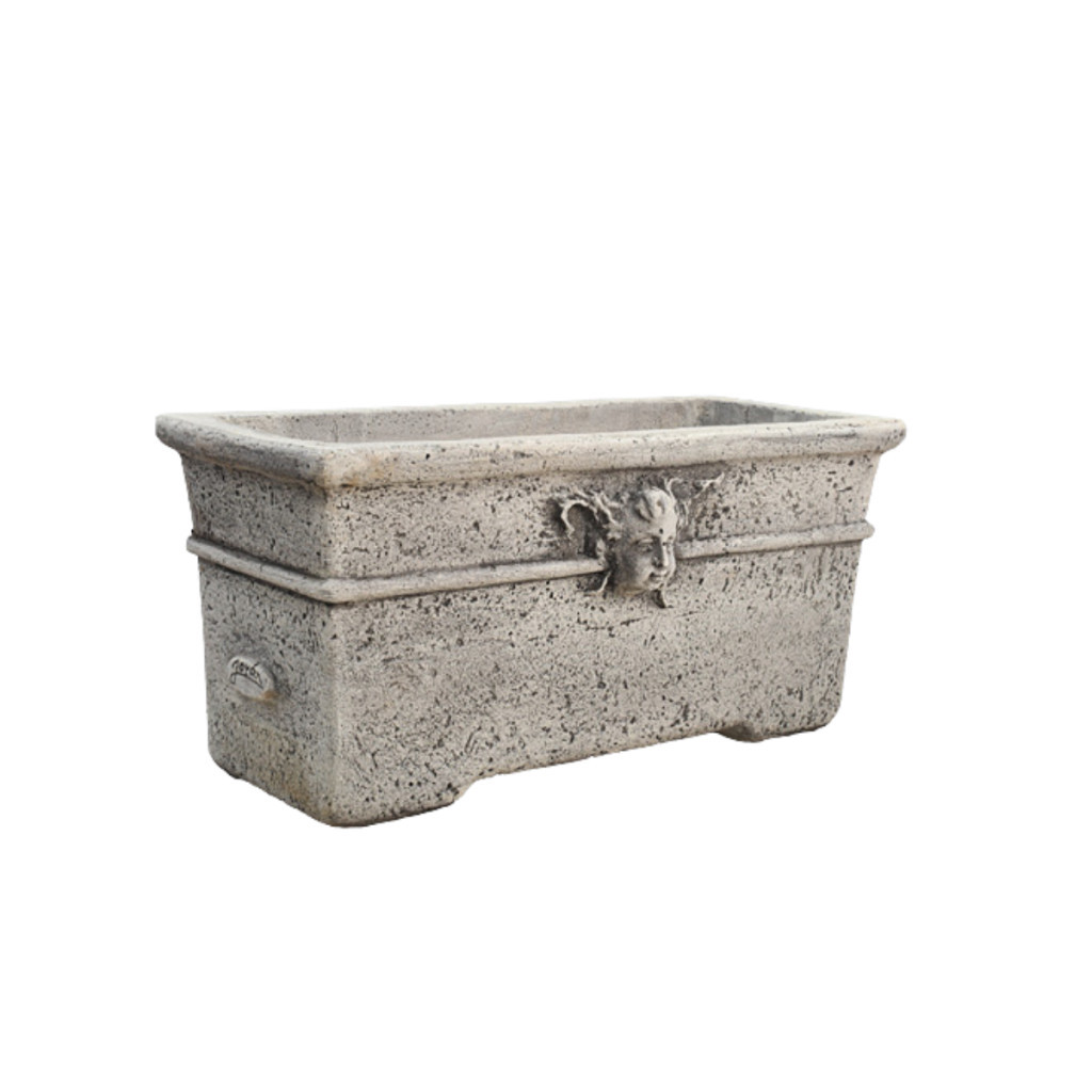 Kő hatású időjárásálló kerti virágvályú Medici fej díszítéssel.