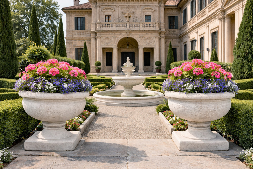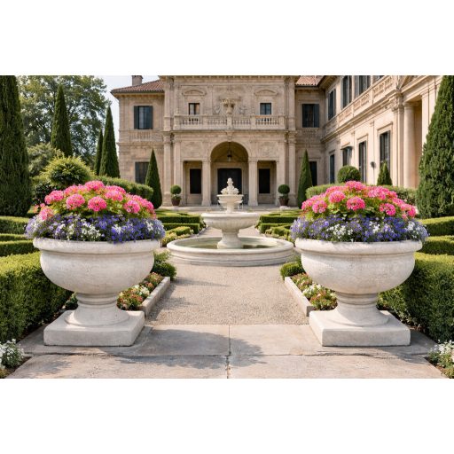 Nagy méretű, időjárás álló kerti kehely kő hatású felület képzéssel.