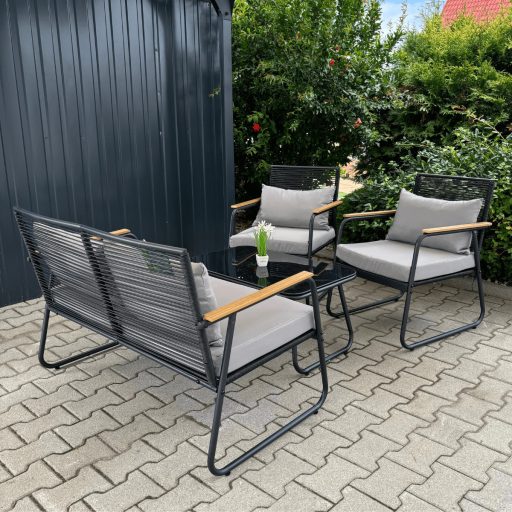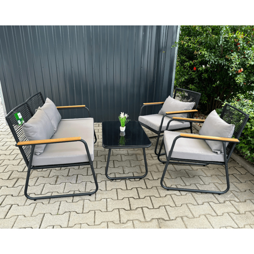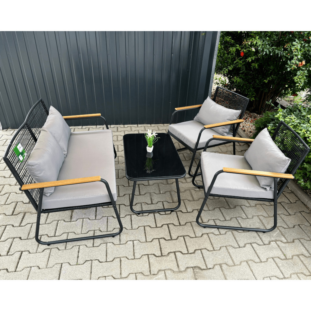 4 Részes Kerti Bútorszett - Kényelem és Elegancia a Szabadban Dobja fel kertjét vagy teraszát ezzel a stílusos és praktikus 4 részes kerti bútorszettel! A szett minden eleme úgy lett tervezve, hogy maximális kényelmet és tartósságot biztosítson, miközben elegáns megjelenésével bármilyen kültéri környezetbe tökéletesen illeszkedik. Szett Tartalma: 1 db Kerti Kanapé: Kényelmes ülőhelyet biztosít több személy számára, ideális családi összejövetelekhez vagy baráti beszélgetésekhez. 2 db Kerti Fotel: Pihentető ülőhelyek egyéni relaxációhoz, ergonomikus kialakítással a maximális kényelem érdekében. 1 db Kávézóasztal üveglappal: Praktikus és elegáns asztal, ahol elhelyezheti italait, könyveit vagy egyéb tárgyait. Főbb Jellemzők: Anyag: Magas minőségű, időjárásálló anyagokból készült, melyek ellenállnak az UV sugárzásnak, esőnek és szélnek is, így hosszú élettartamot garantálnak. Kényelem: Vastag, puha párnák, amelyek levehető és mosható huzattal rendelkeznek, hogy mindig tisztán és frissen tarthassa őket. Design: Modern és elegáns megjelenés, amely bármilyen kültéri környezetbe illik, legyen az kert, terasz vagy erkély. Könnyű Összeszerelés: Egyszerűen és gyorsan összeszerelhető, a csomag minden szükséges szerelési eszközt tartalmaz. Méretek: Kerti Kanapé: 115 cm x 60 cm x 77 cm (H x Sz x M) Kerti Fotelek: 60 cm x 57 cm x 77 cm (H x Sz x M) Kávézóasztal: 80 cm x 50 cm x 40 cm (H x Sz x M) Színek: A szett fa berakása igazán elegánssá varázsolja a szürke keretét a bútornak Rendelje Meg Most! Fedezze fel a kerti élet örömeit ezzel a gyönyörű és kényelmes bútorszettel. Rendelje meg most, és élvezze a szabadban töltött idő minden pillanatát!