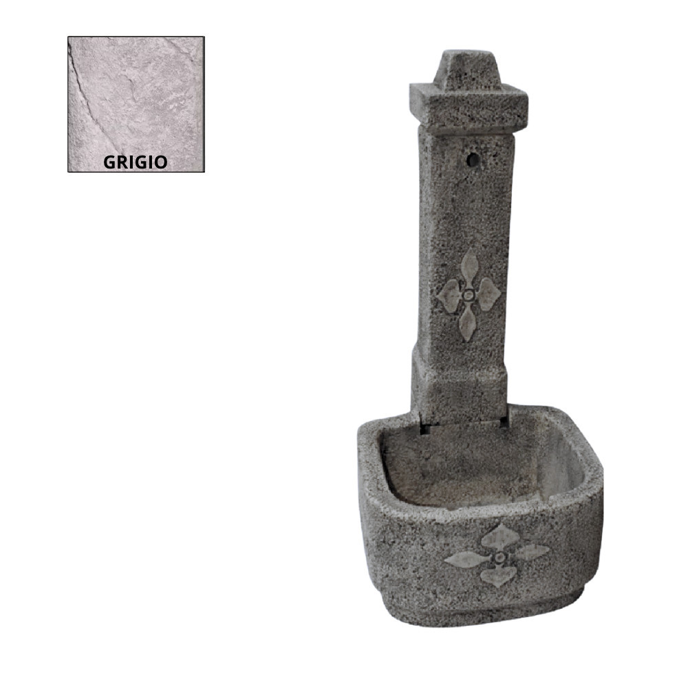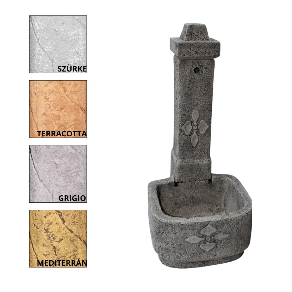 Szabadon álló kerti kút kifolyóval. A vízhálózatba kötés a kútoszlop aljáról történik. Méret: 114 x 53 x 61 cm Súly: 143 kg Fagyállóság: Fagyálló Felület: Időjárás ás kopásálló  Gyártó: FabroStone. A termék több színben rendelhető, kérjük megjegyzésben feltüntetni a választott színt. Az ár nem tartalmazza a csapot, kérjük a termék rendelésekor figyelembe venni!