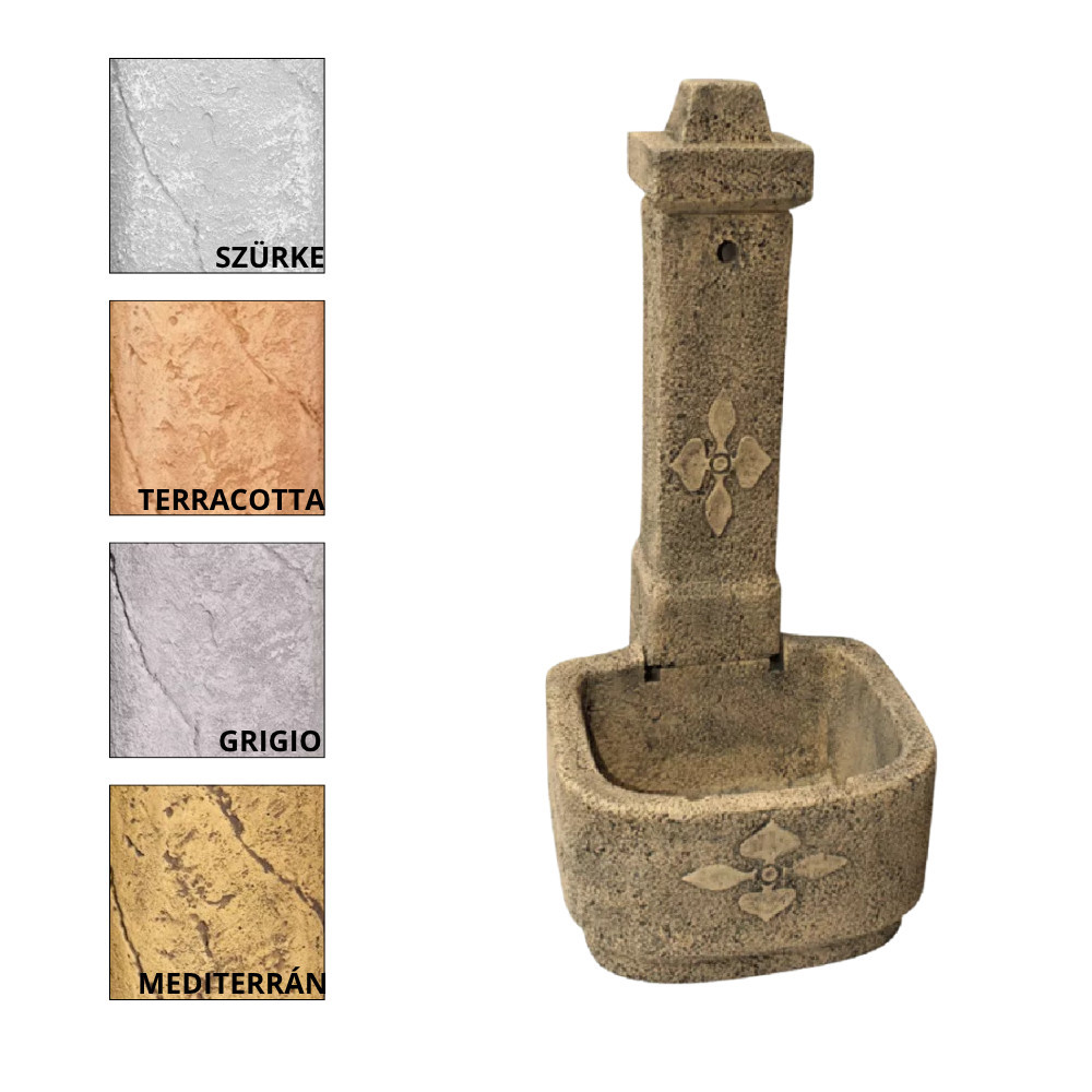 Szabadon álló kerti kút kifolyóval. A vízhálózatba kötés a kútoszlop aljáról történik. Méret: 114 x 53 x 61 cm Súly: 143 kg Fagyállóság: Fagyálló Felület: Időjárás ás kopásálló  Gyártó: FabroStone. A termék több színben rendelhető, kérjük megjegyzésben feltüntetni a választott színt. Az ár nem tartalmazza a csapot, kérjük a termék rendelésekor figyelembe venni!