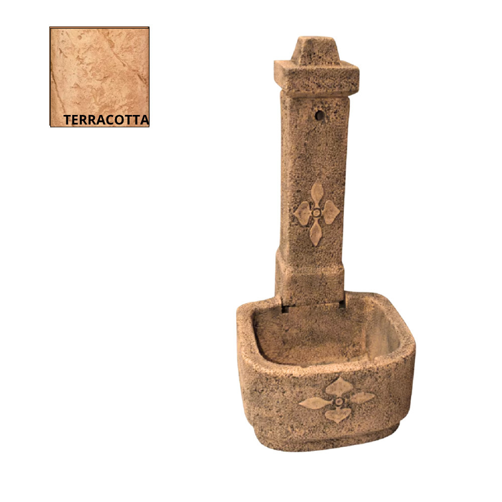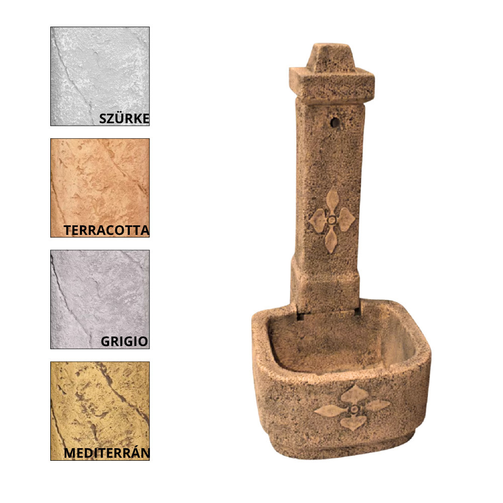 Szabadon álló kerti kút kifolyóval. A vízhálózatba kötés a kútoszlop aljáról történik. Méret: 114 x 53 x 61 cm Súly: 143 kg Fagyállóság: Fagyálló Felület: Időjárás ás kopásálló  Gyártó: FabroStone. A termék több színben rendelhető, kérjük megjegyzésben feltüntetni a választott színt. Az ár nem tartalmazza a csapot, kérjük a termék rendelésekor figyelembe venni!