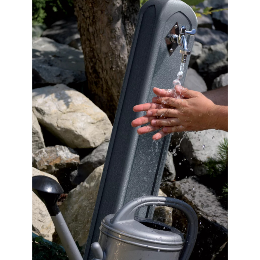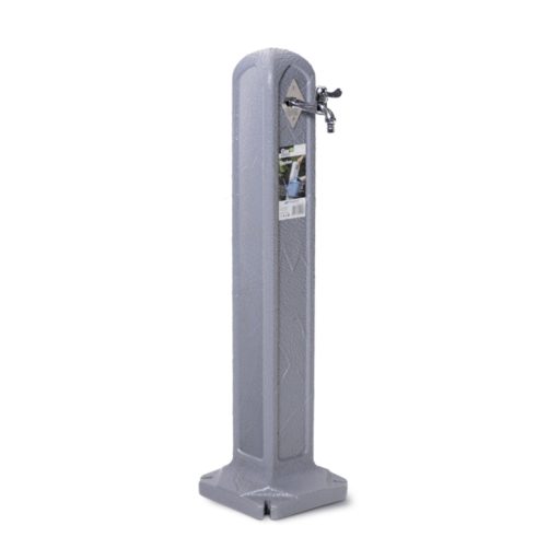 Műanyagból készült, világos szürke kerti kút. Nem csak egy hasznos eszköz, de a kert ékes dísze is lehet. A vizet egy gyorscsatlakozóval egyszerűen csatlakoztathatjuk, de esővízgyűjtő is ráköthető a kútra.  Mérete: 24x24x90 cm Szürke színű Gránit hatású