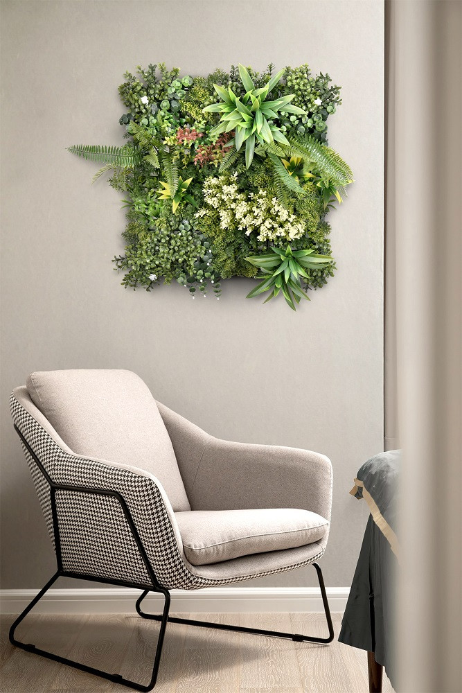 Természetes hatású verikális növényfal, mely élethű és gondozásmentes. Rögzítése egyszerű, méretre vágható. Márete 50 x 50 cm