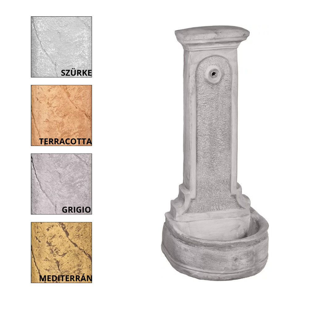 Mediterrán hangulatú robosztus kerti kút kifolyóval, egy darabban. Szabadon álló kő kerti kút, bekötése a kútoszlop alján kialakított beépített 3/4" méretű horganyzott cső csatlakozásra történik. A termék több színben rendelhető, kérjük megjegyzésben feltüntetni a választott színt. Méret: 110 x 48 x 43 cm Súly: 101 kg Fagyállóság: Fagyálló. Felület: Időjárás és kopásálló Gyártó: FabroStone. Az ár nem tartalmazza a csapot, kérjük a termék rendelésekor figyelembe venni!