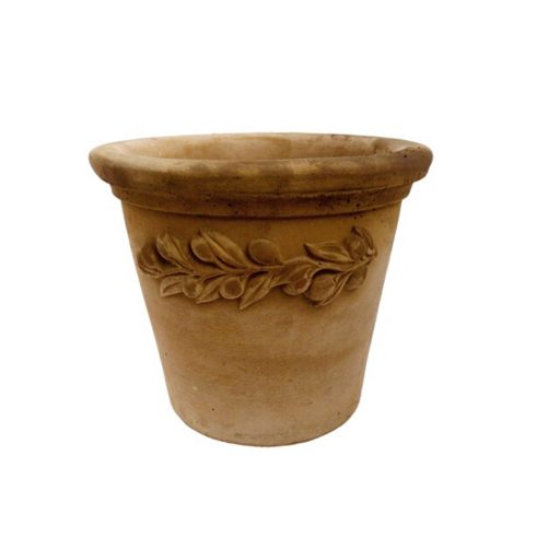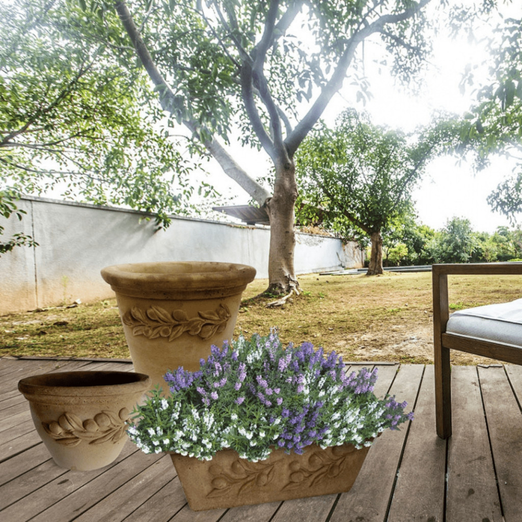 Mediterrán hangulatú kő kerti virágtartó. A fagyállóság biztosítása érdekében használjon a virágtartó aljában egy réteg geotextíliát és kavicságyat.