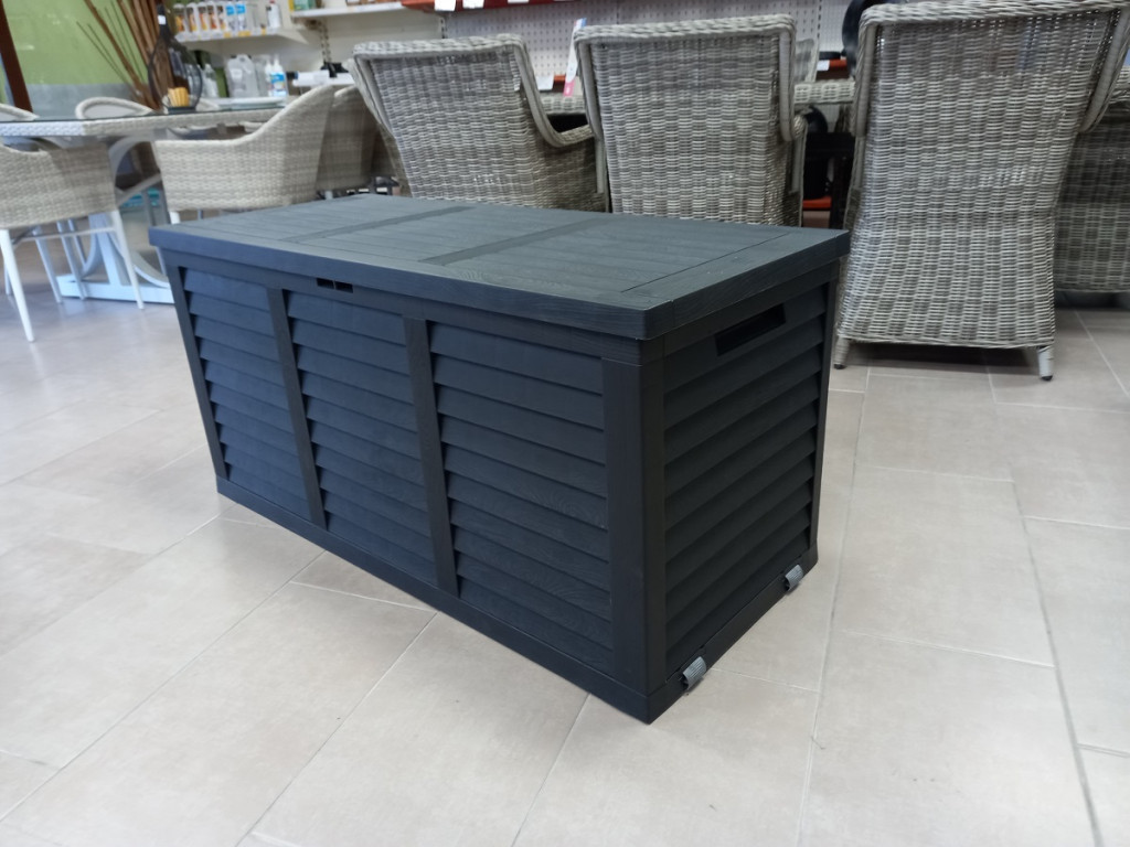 300 literes fa mintázatú műanyag párnatartó láda kerekekkel.