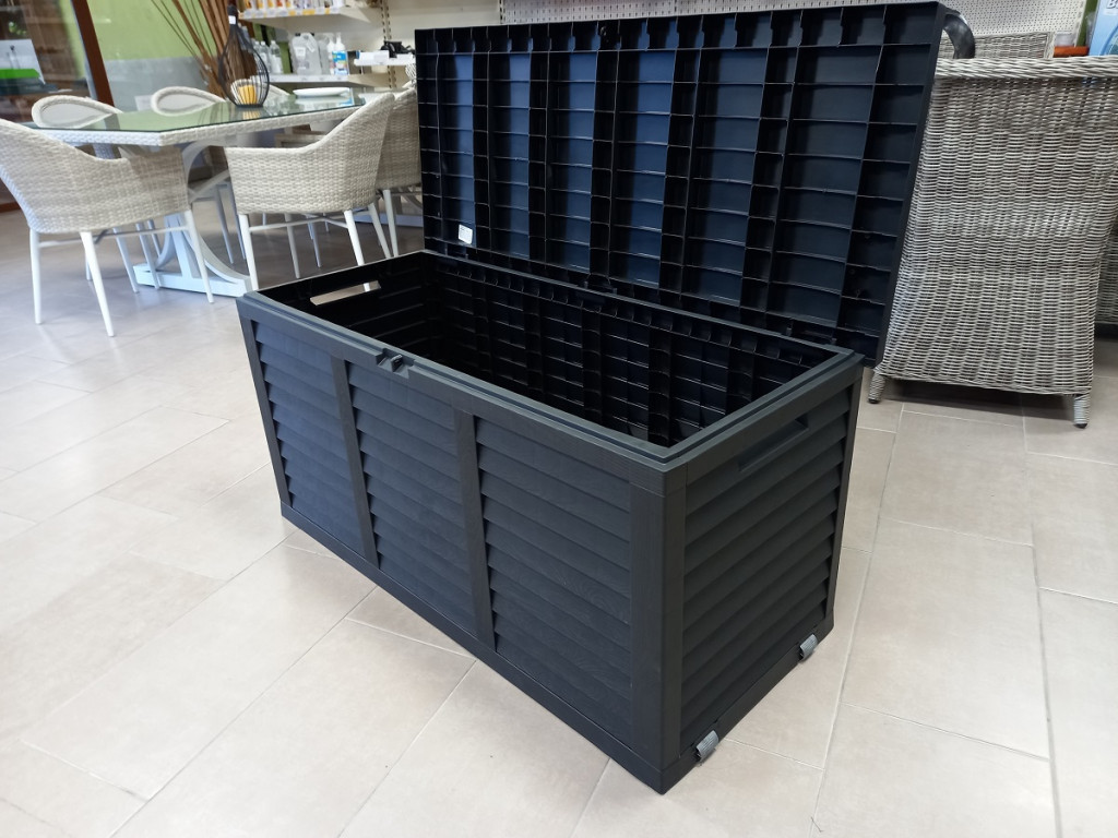 Ez a dekoratív párnatartó rengeteg helyet biztosít a párnáknak, a takaróknak és egyéb holmiknak és védi őket az esőtől és a naptól. A két oldalsó fogantyúnak és kerekeinek köszönhetően könnyen mozgatható. Fedele lakatolható.