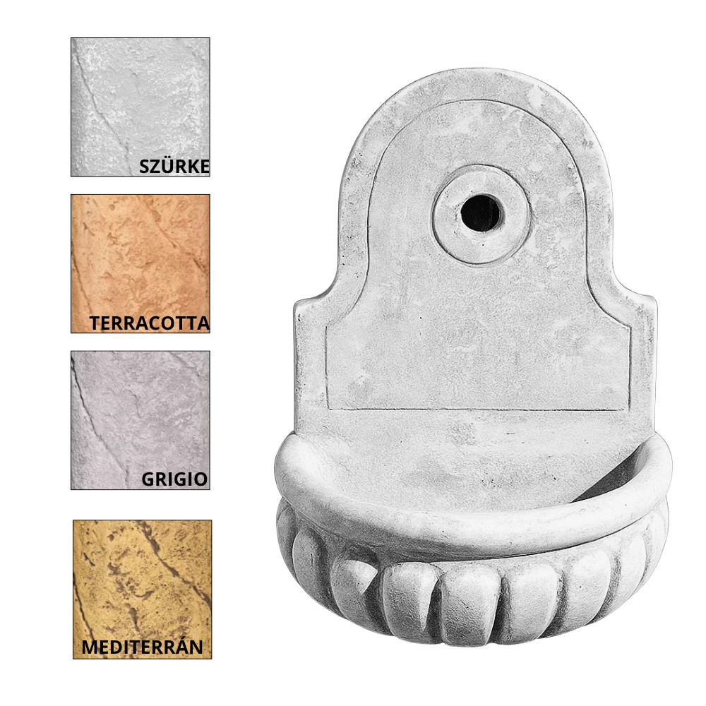 Mediterrán jellegű kis méretű kerti fali kút, kültérre. Bekötése a háttámla felől a falból történik. Színei természetesek és tartósak. Méret: 48x 38 x 27 cm Súly: 21 kg Felhasználhatóság: kültér anyaga: beton Fagyállóság: Fagyálló Gyártó: FabroStone Felület: Időjárás és kopásálló  Az ár nem tartalmazza a csapot, kérjük a termék rendelésekor figyelembe venni!