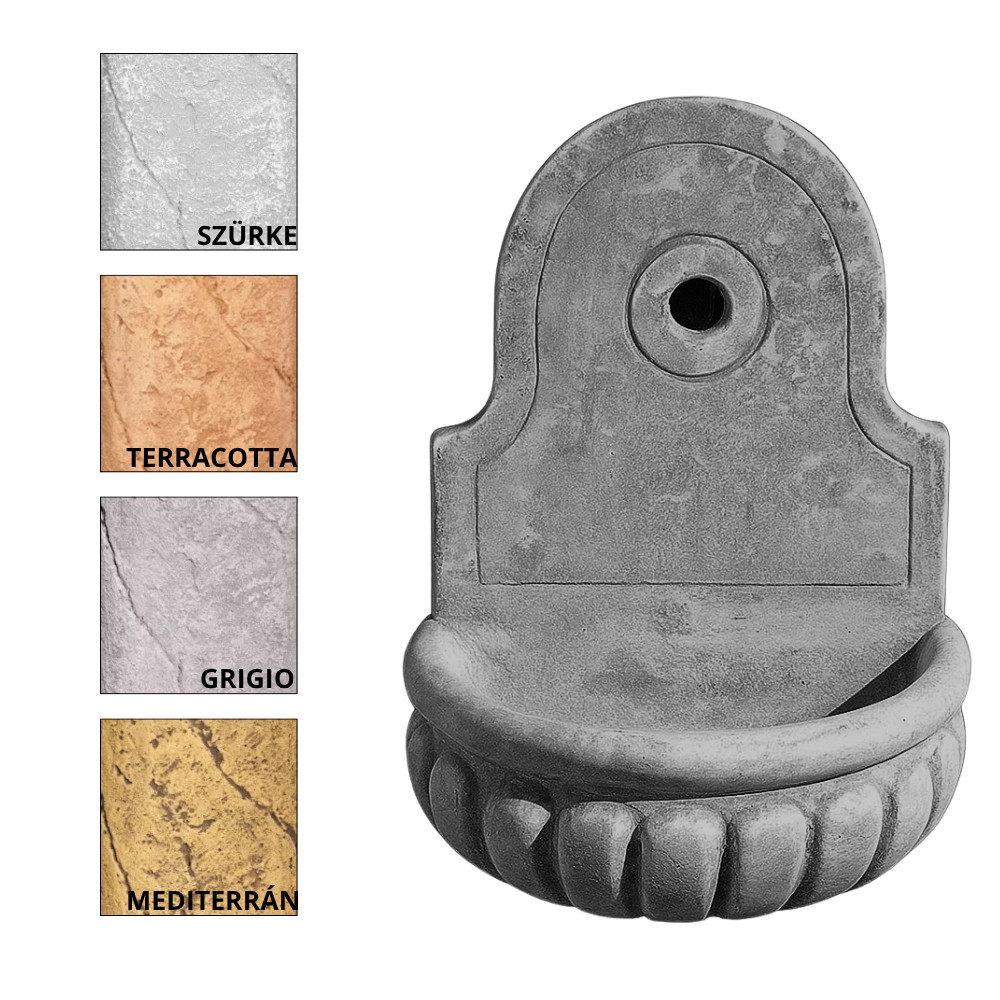 Mediterrán jellegű kis méretű kerti fali kút, kültérre. Bekötése a háttámla felől a falból történik. Színei természetesek és tartósak. Méret: 48x 38 x 27 cm Súly: 21 kg Felhasználhatóság: kültér anyaga: beton Fagyállóság: Fagyálló Gyártó: FabroStone Felület: Időjárás és kopásálló  Az ár nem tartalmazza a csapot, kérjük a termék rendelésekor figyelembe venni!