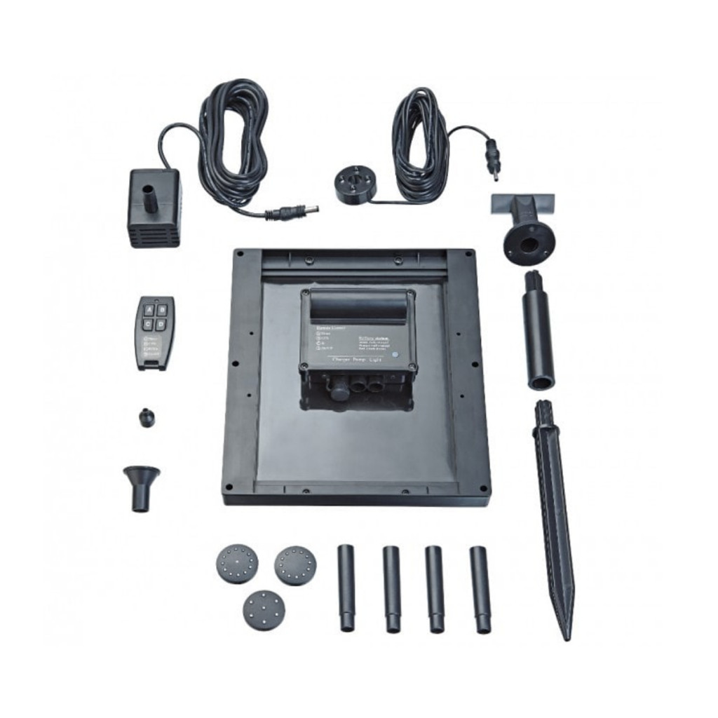 Pontec PondoSolar 250 Control - napelemes szökőkút Napelemmel vezérelt szökőkút, elektromos csatlakoztatást nem igényel. A Pontec PondoSolar napenergiával működő távirányítható szökőkút, amely látványos vízképet mutat napos időben. Technikai Adatok: Nincs szükség elektromos csatlakozásra. 250 liter/óra teljesítmény 9V-os szivattyú távirányító LED fények 3 wattos szolár panel Li-Ion akkumulátor 7.4 V - 2000 mAH Tartalmazza a csatlakozókat és a 4 db különböző vízképet biztosító fúvókát.