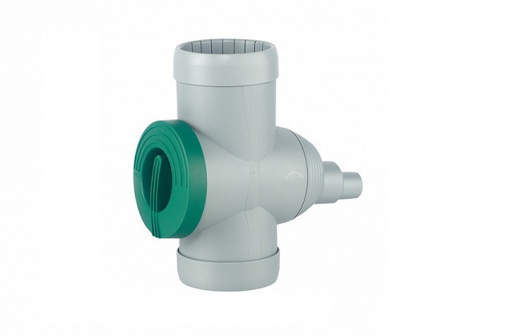Rozsdamentes szűrő betéttel ellátott ereszcsatornába szerelhető műanyag bekötő elem esővíz gyűjtőkhöz.