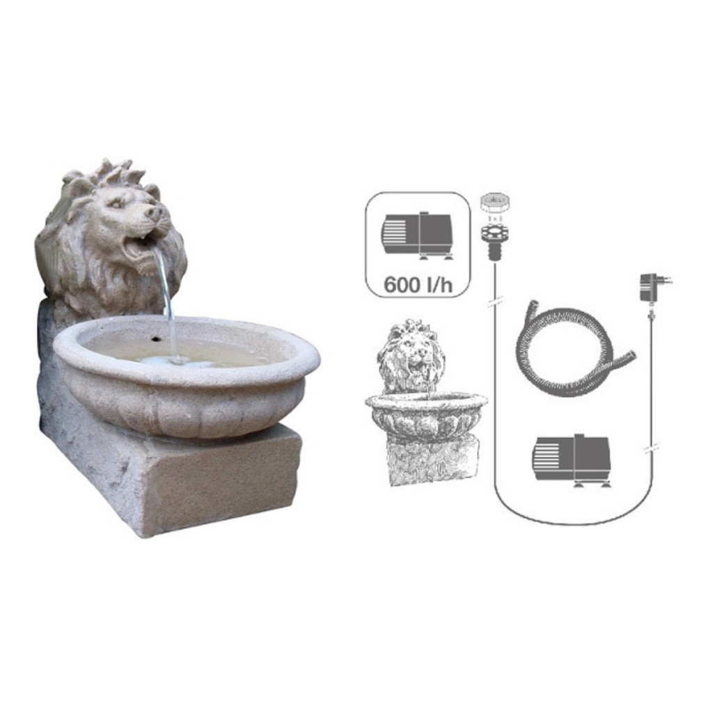 Kerti csobogó szett Basel Klasszikus homokkő-effektes oroszlánfej csobogó. Önállóan elhelyezve középpontja a kertnek vagy terasznak, növények közé telepítve pedig gyönyörűen illeszkedik a kert többi részéhez. Az esti órákban finom fénnyel világít.Komplett szett, minden szükséges kellékkel. Tartozékok: 600 l/h teljesítményű szivattyú Spirál tömlő, csatlakozók LED fénygyűrű és csatlakozó kábel Csobogó felépítmény Adatok: A csobogó méretei: 52 x 38 x 45 cm Anyaga: polyresin Jellemzők: Bármilyen sík, kemény felületen elhelyezhető. Elsősorban kültéri elhelyezésre alkalmas. A kicsomagolást követően vízzel kell feltölteni, majd áram alá helyezni és máris működik.