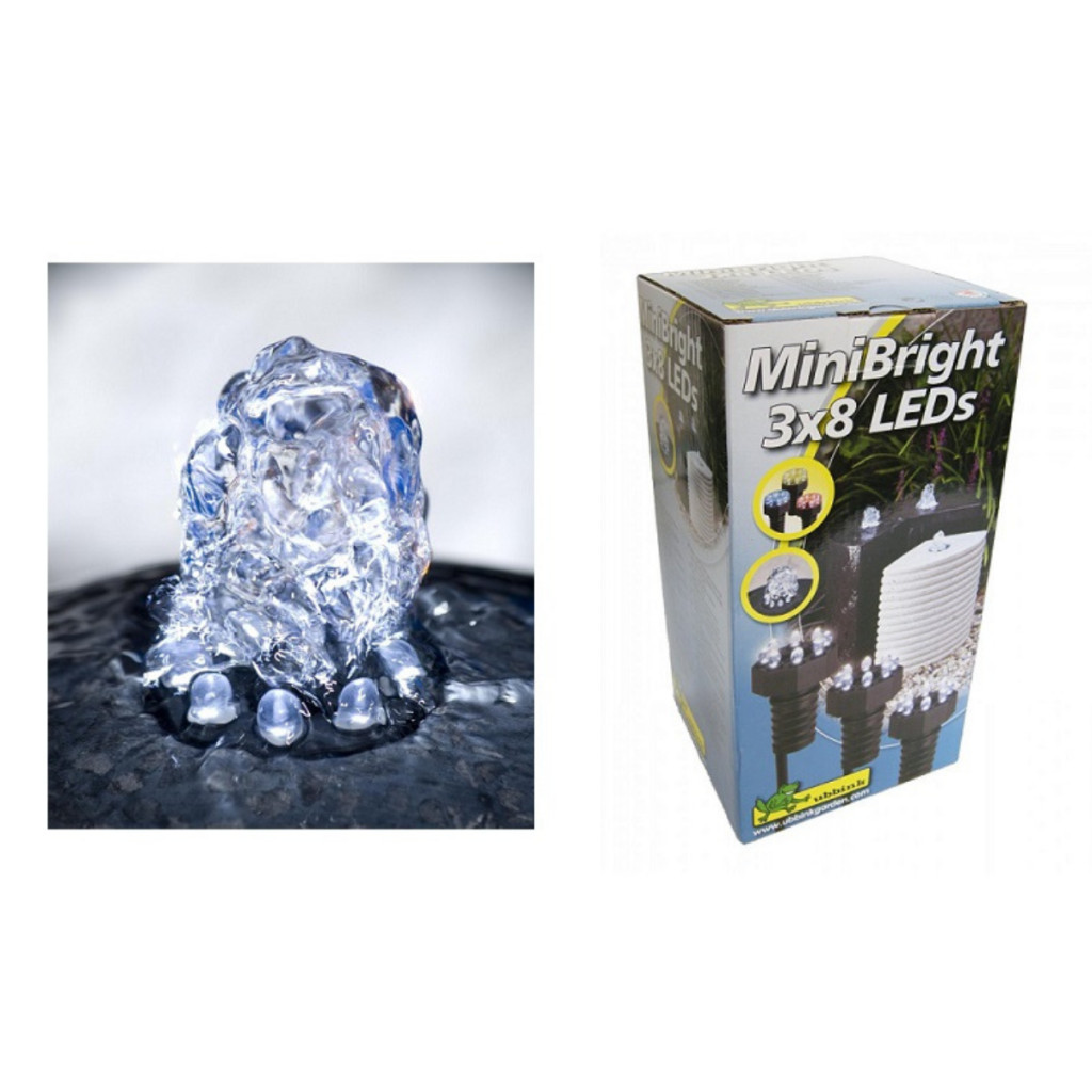 Az Ubbink Mini Bright LED világítás kerti csobogókhoz tervezték. A LED lámpák közvetlenül a csobogóhoz vezető tömlőbe helyezhetőek.  Tartozék: 3 x 8 LED világítás 3 x 3 színes korong  Gyártó: Ubbink  Telepítéshez szükséges átmérő: Ø 42 mm, mélysége: 25 mm  Transzformátor: 230 V/12 V Teljesítmény: 3 x 1 W (lámpánként 1 W) Transzformátor kábel hossza: 3,5 m  Lámpa kábel hossza: 3 x 1,5 m  Színes korongok