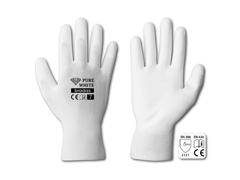 Bradas Pure White poliuretánnal bevont védőkesztyű, poliészter anyagból mely nagy vágási és szakadási ellenállással rendelkezik. Tökéletes a precíziós kézi munkákhoz.