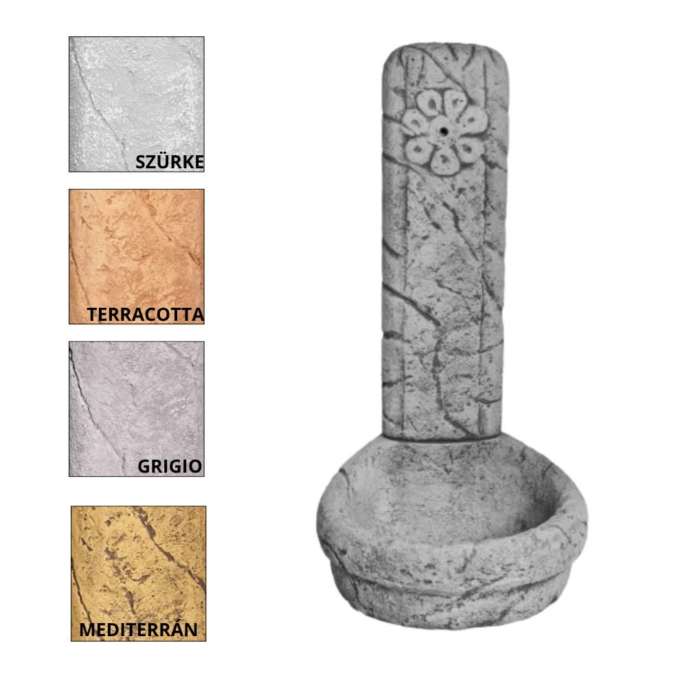 Rusztikus szabadon álló kerti ivókút virág motívummal és kifolyóval. Bekötése vízhálózatba a kútoszlop aljáról történik. Méret: 117 x 60 x 62 cm Súly: 136kg Fagyállóság: Fagyálló Felület: Időjárásálló és kopásálló Gyártó: FabroStone Az ár nem tartalmazza a csapot, kérjük a termék rendelésekor figyelembe venni!
