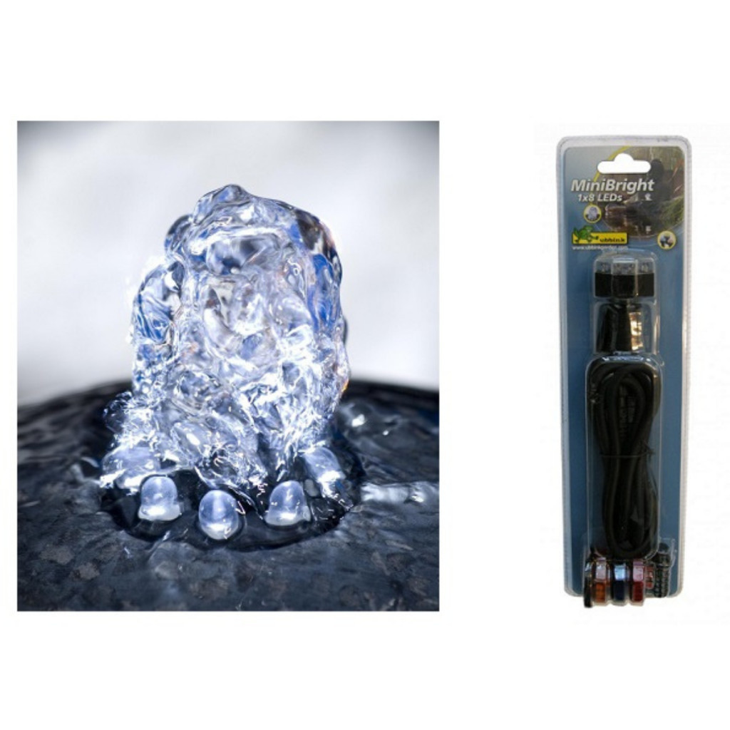 Az Ubbink Mini Bright LED világítás kerti csobogókhoz tervezték. A LED lámpák közvetlenül a csobogóhoz vezető tömlőbe helyezhetőek.  Tartozék: 1 x 8 LED világítás 1 x 3 színes korong  Gyártó: Ubbink  Telepítéshez szükséges átmérő: Ø 42 mm, mélysége: 25 mm  Teljesítmény: 1 W  Lámpa kábel hossza: 1,5 m  Színes korongok